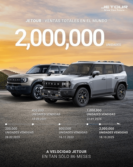 El ritmo de crecimiento de JETOUR ha sido sorprendente. La compañía tardó poco más de cinco años en alcanzar su primer millón de unidades producidas, cifra lograda a inicios de 2024. Sin embargo, apenas 20 meses después duplicó esa cantidad, alcanzando los dos millones de vehículos completamente ensamblados.