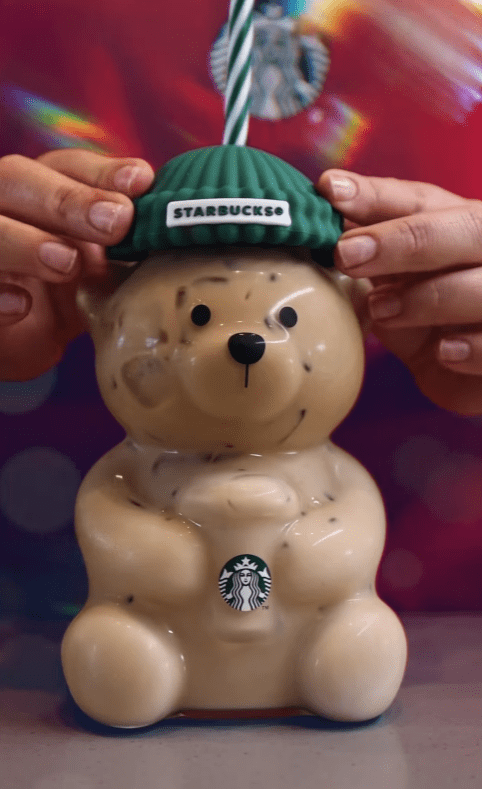 Inspirado en el icónico osito de Starbucks, el vaso Bearista es una pieza de colección elaborada en vidrio, pensada para transmitir el espíritu festivo y la calidez que caracteriza a la marca durante las celebraciones de fin de año.
